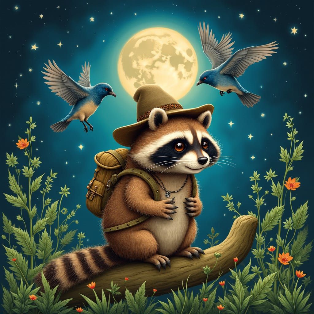 A whimsical image of three bluebirds in a starry night sky, alongside a raccoon with a hat, backpack, and peace pendant, sitting on a log surrounded by marijuana plants. The image is rendered with bright psychedelic patterns.