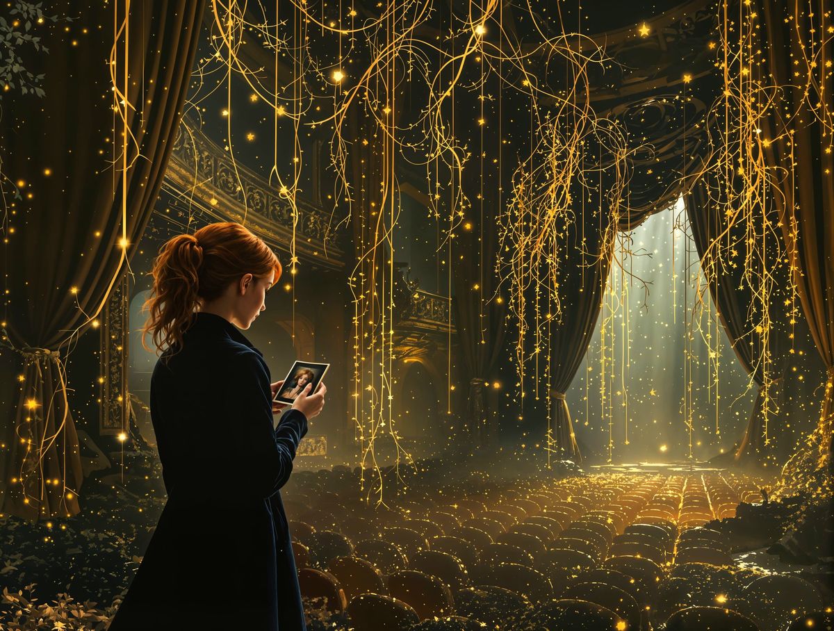 This image is a highly detailed digital artwork featuring a crumbling theatre with a petite figure and ethereal threads, set against a backdrop of shimmering theatre seats and decaying stage curtains.