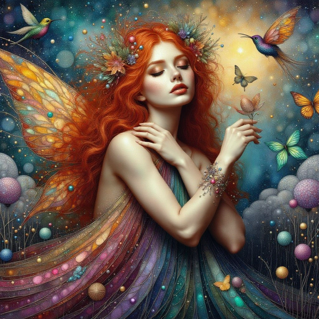 A vibrant image of a fairy casting spells amid hummingbirds and butterflies. This digital art piece features intricate details, rich color depth, and dramatic lighting, creating a whimsical, hyperrealistic scene.