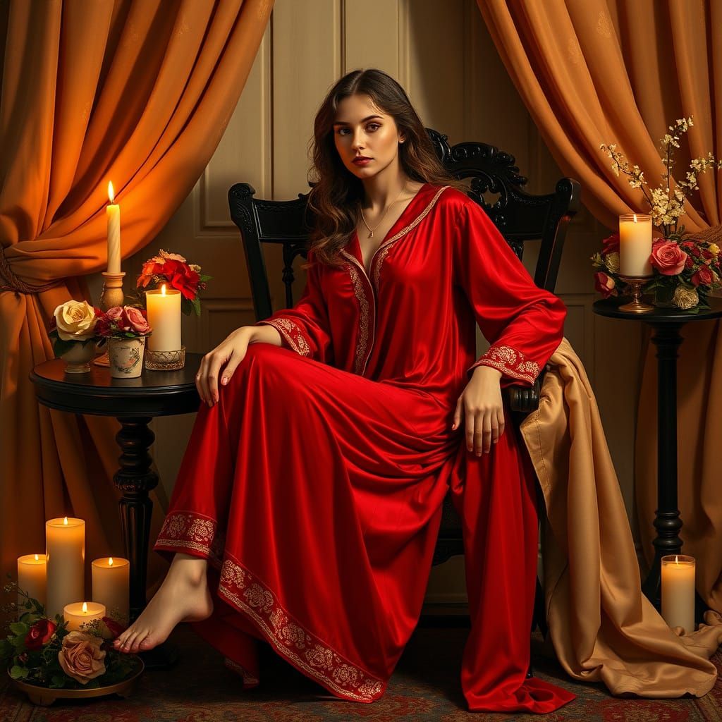 This image shows a woman in red and gold attire seated in a candlelit room with flowers. The artwork evokes the style of Art Nouveau with warm colors and dramatic shadows.