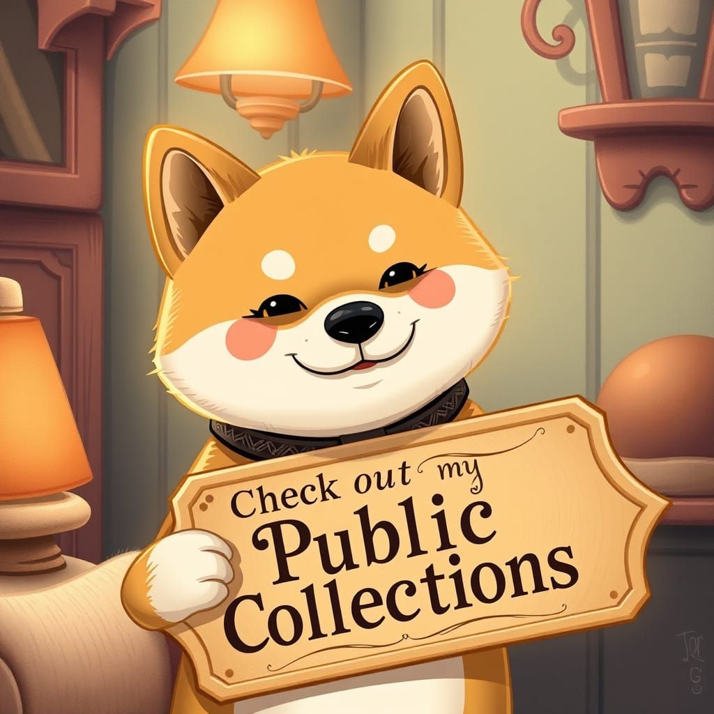 This image shows a Shiba Inu wearing a collar and holding a sign. The art style blends whimsical elements with intricate textures and warm lighting, creating a cozy, inviting atmosphere.