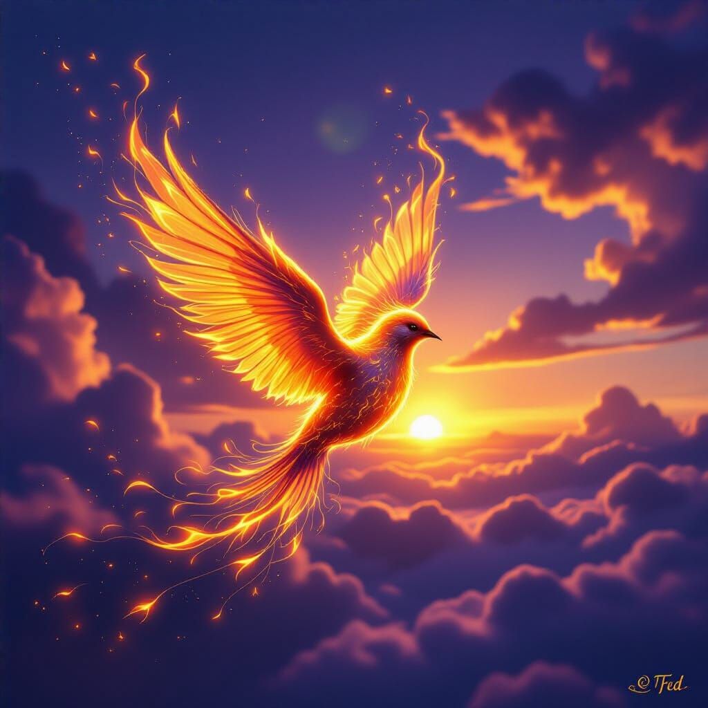 This image shows a small bird composed of living fire. The fantasy artwork features translucent flames, glowing embers and a vibrant color palette. The bird soars through a twilight sky.
