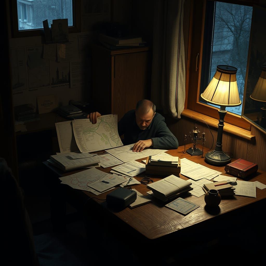 A man sits in a dimly lit apartment, surrounded by papers and blueprints, his eyes scanning every detail with precision and patience. He's a secret agent on a mission to infiltrate a Soviet military base, extracting crucial information to alter the balance of power.
