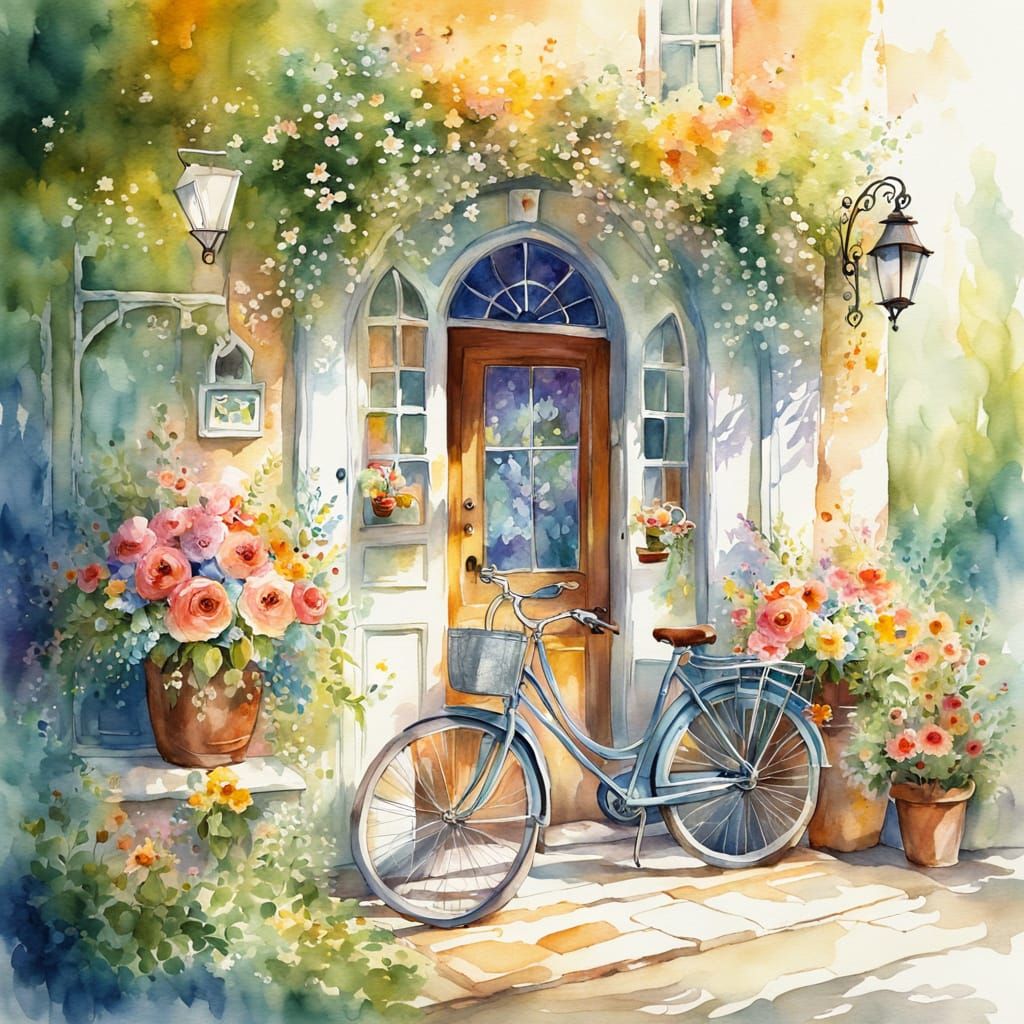 This image shows a bicycle leaning against a flower-covered door in a fantasy setting. The scene is rendered in watercolor style with soft, dreamy brushstrokes and vibrant floral patterns, bathed in warm sunlight.