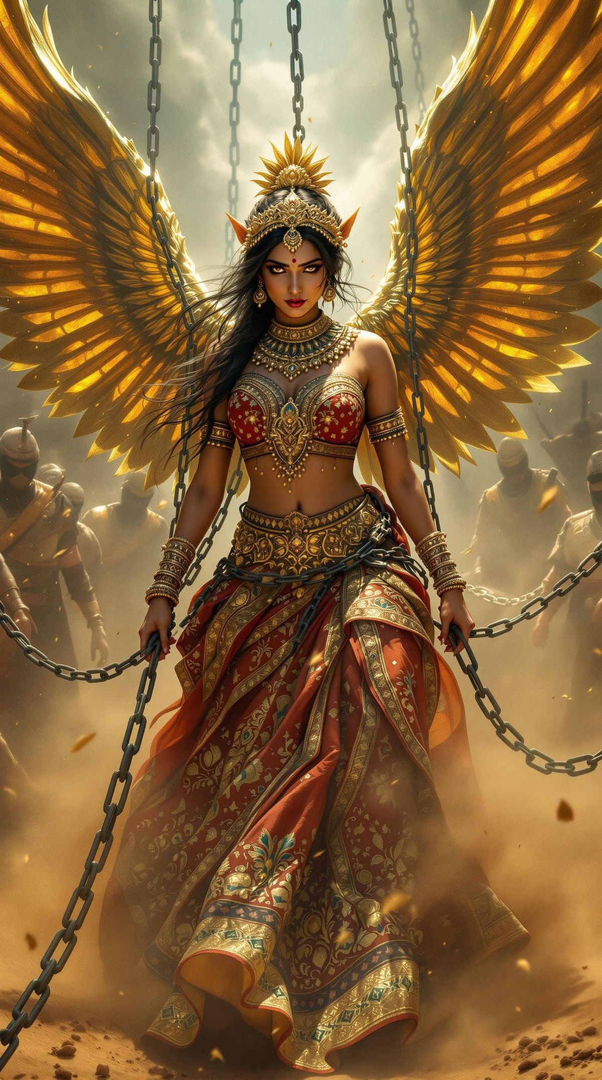 A dramatic image of Sonpari in chains, her golden wings failing as Rajasthani soldiers look on. The scene is rendered with dramatic lighting and hyperrealistic detail in the style of classical Indian painting.