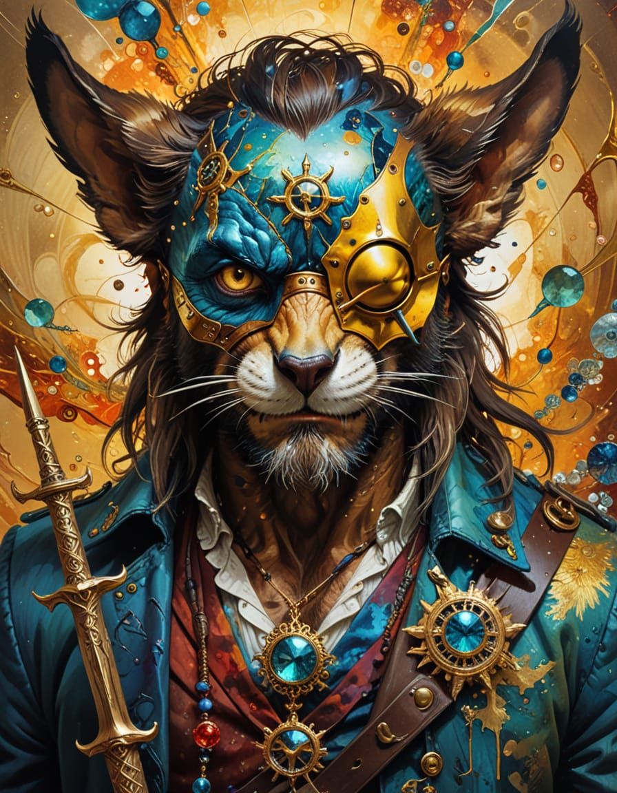 A close-up surrealist painting of a wolverine pirate on a treasure ship. The animal wears an eyepatch and holds a tiny sword, rendered with flowing alcohol ink and iridescent patterns in warm, earthy tones.