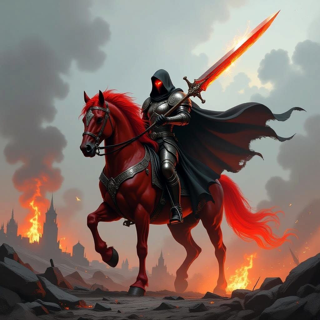A striking picture of a knight on a red horse with a sword, surrounded by destruction. The image features dark fantasy elements and a dystopian aesthetic.