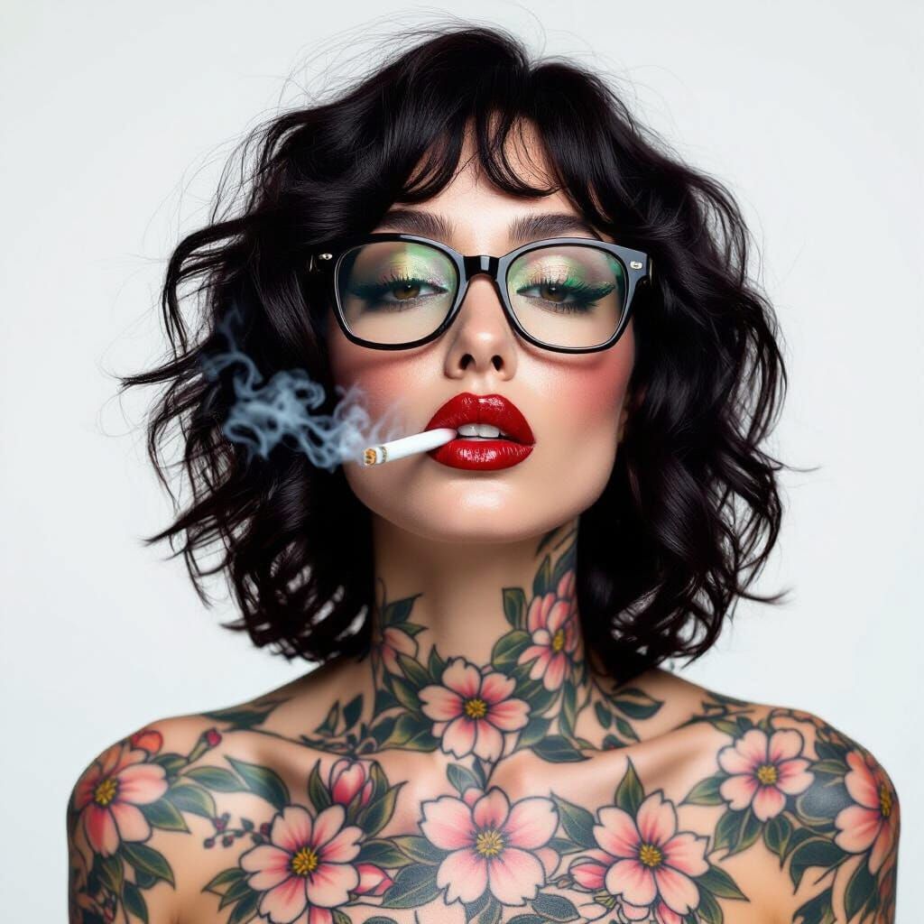 A professional studio portrait of a woman with curly black hair, glasses, and full-body cherry blossom tattoos, exhaling smoke. Captured with sharp focus and bokeh.