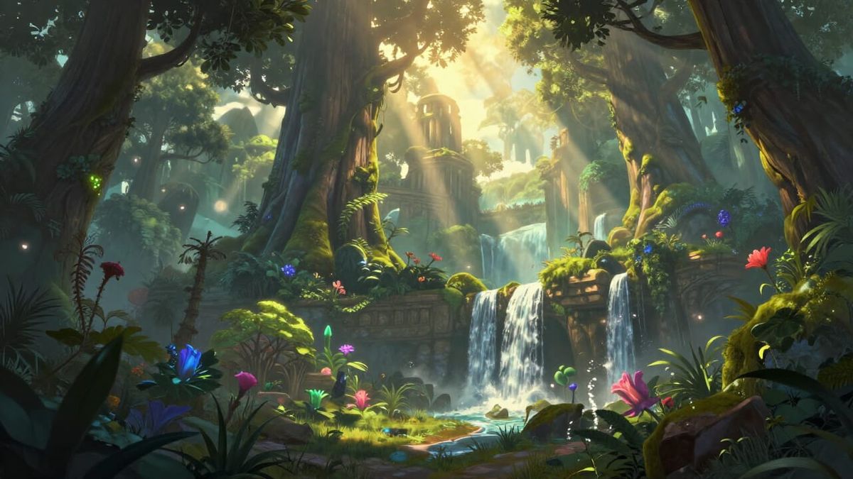 This image depicts a dramatic fantasy landscape with lush vegetation, ancient ruins, and waterfalls. Ethereal lighting creates a golden-hour glow with dynamic shadows, in a concept art style.