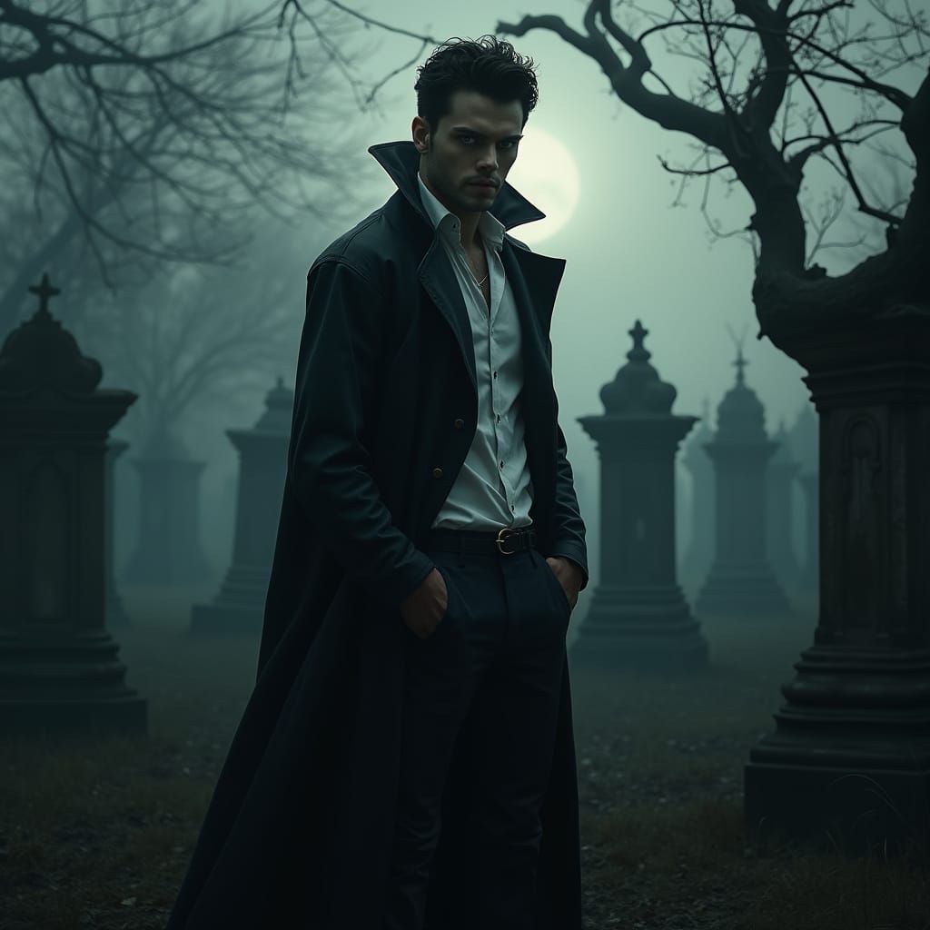 This image shows a mysterious vampire standing in a misty graveyard at dusk, surrounded by eerie tombstones and twisted tree branches, with a hint of romance and darkness, created in a style blending Tim Burton's whimsy and Zdzisław Beksiński's surrealism with Ash Thorp's digital art aesthetic.
