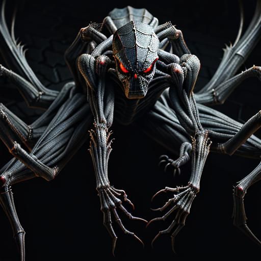A hyperrealistic image of a man-spider hybrid standing in a dark alley. The image features intense lighting and shading, sharp textures and a dark, muted color scheme. The art style evokes body horror.