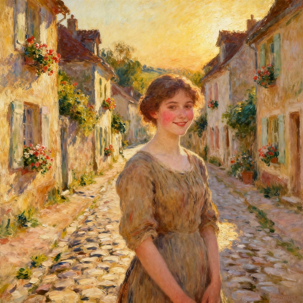 This image shows a young woman in a rustic dress on a cobblestone path in a charming village. The scene is bathed in warm, golden light, painted in an impressionistic style with vibrant, textured brushstrokes.
