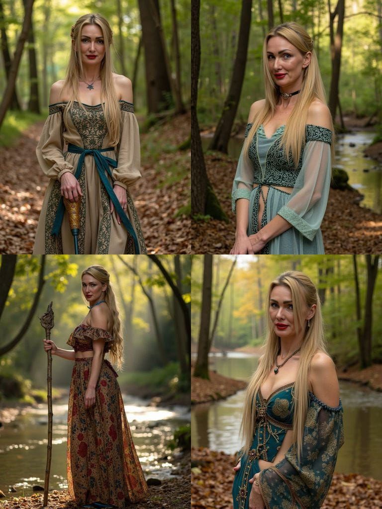 This image depicts a stunning Russian woman standing confidently in a serene forest clearing, surrounded by nature's beauty and adorned with mystical symbols. Her elegant features and flowing dress blend seamlessly into the enchanted atmosphere.