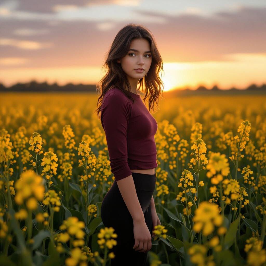 This image shows a teenage girl in a yellow canola field during golden hour. The scene is bathed in warm light, creating a serene and vibrant atmosphere with rich, complementary colors.