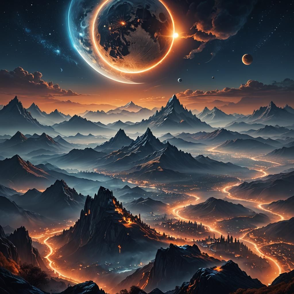 A wide-angle shot of the Earth at night, showing three glowing moons over a misty mountain range. City lights glow on the horizon in this highly detailed matte painting.