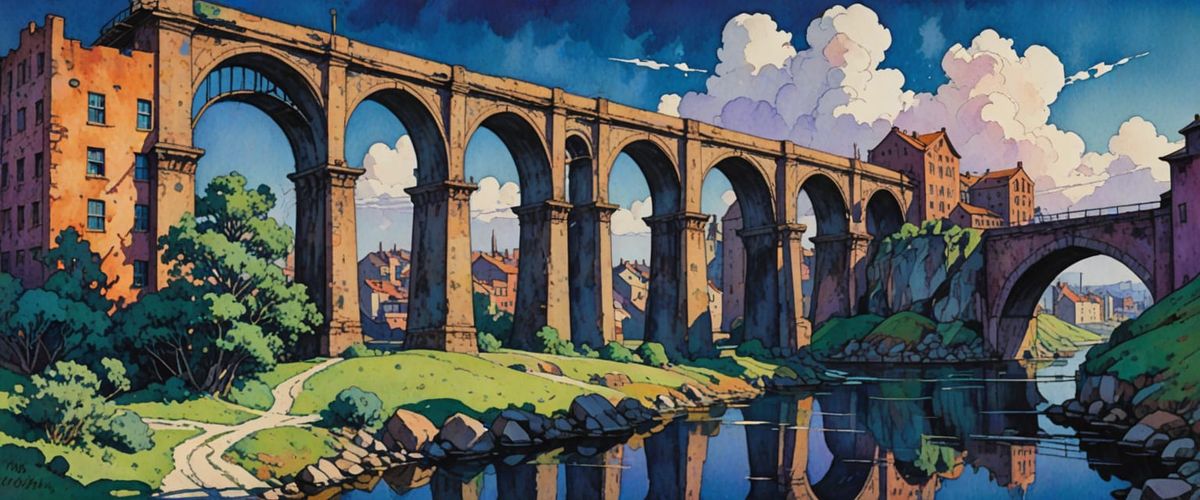 A landscape of an industrial wasteland featuring an arched bridge under a bright sky. The image is rendered with impressionistic watercolor and gouache techniques, with volumetric lighting.