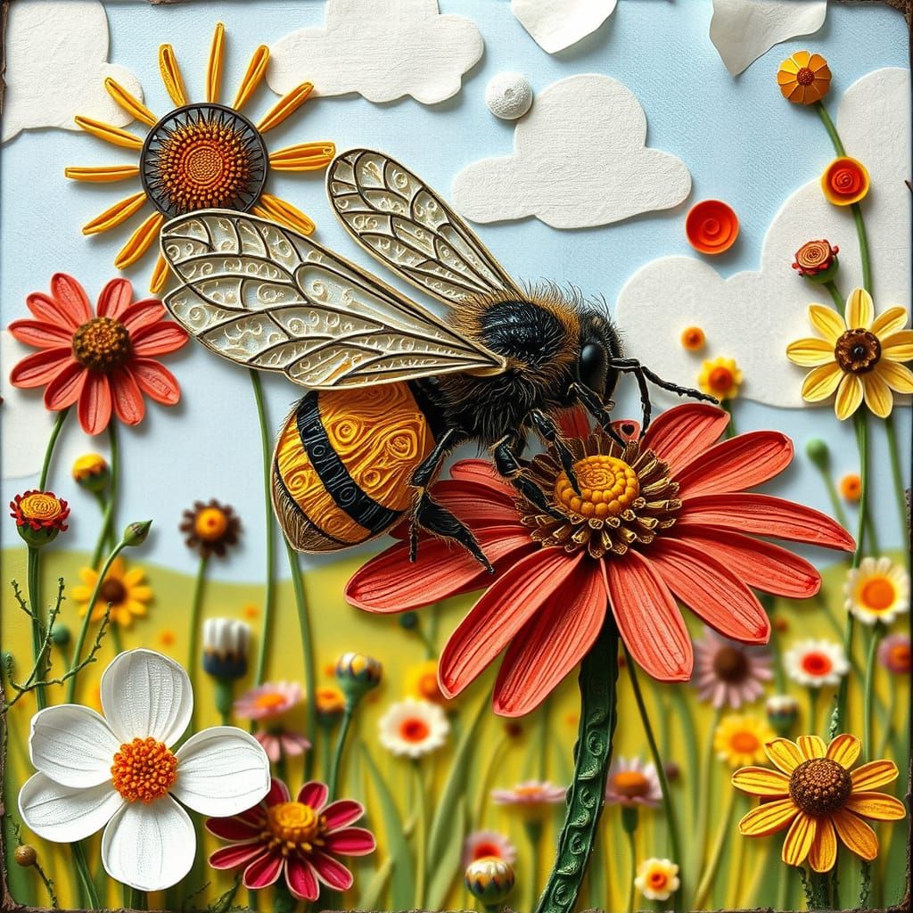 Random. Mixed media quilling and stained glass art. Highly textured bee flitting from flower to flower in a sunny field. Thread and quilling and stained glass composition. Mixed media montage. Stunning. Beautiful. Captivating. Alluring. Depth of field.