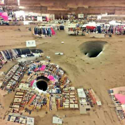 This image depicts a vast, gaping hole in the center of a desert flea market. The scene evokes a sense of surreal desolation and unexpected contrast.