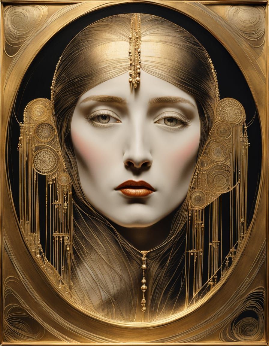 This image shows a hauntingly beautiful gothic woman in a midshot portrait, set against a backdrop of gilded details and metallic tones reminiscent of Art Nouveau