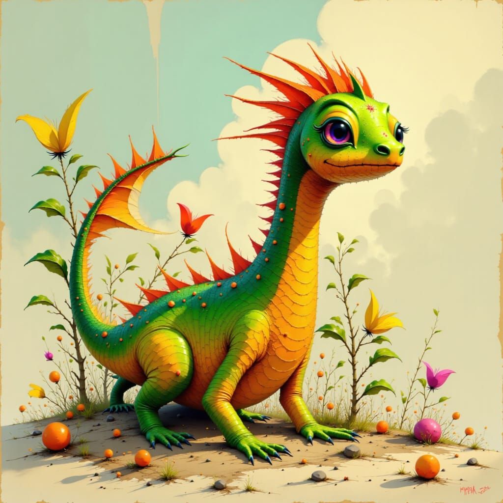 This image shows a whimsical papaya-dragon hybrid with a long neck and scales resembling papaya skin. The vibrant artwork is reminiscent of Gurney, Loish, and Stalenhag's styles.