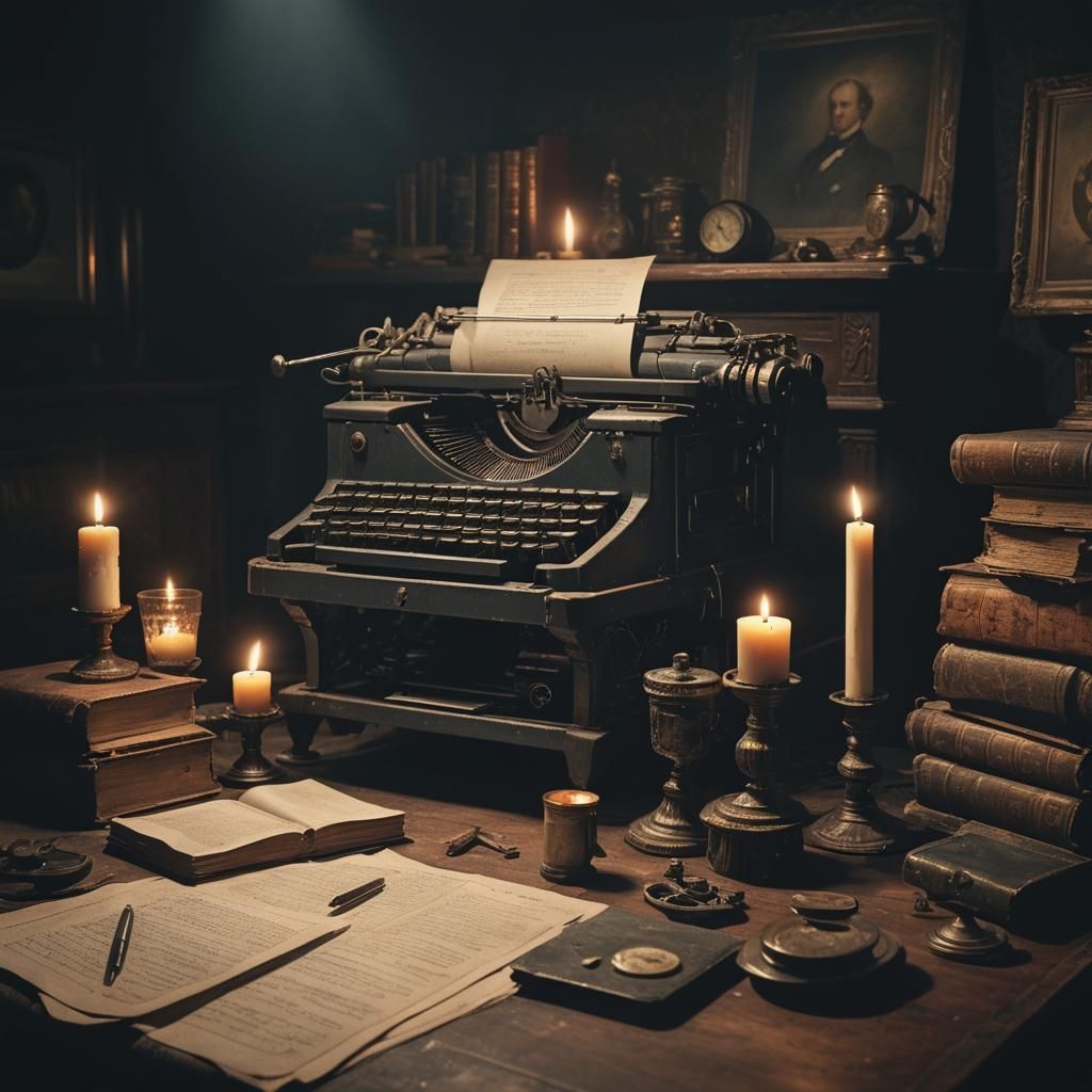 This image shows a vintage desk illuminated by candlelight in a darkened room, featuring an antique typewriter. The scene is depicted with rich detail and dramatic, cinematic lighting.
