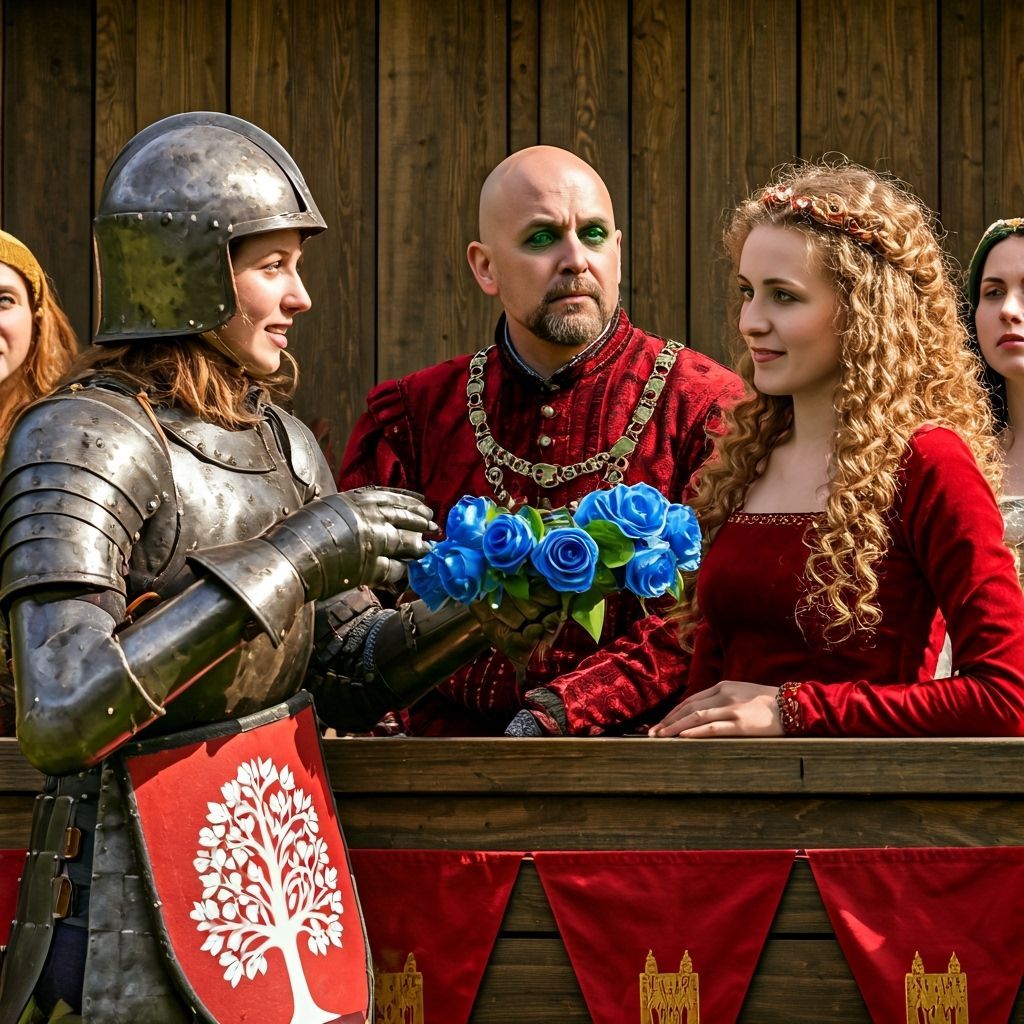 This image shows a medieval knight tournament scene. A young woman knight presents a wreath to a noblewoman as onlookers react with surprise. The scene is rich with period attire and heraldic details.