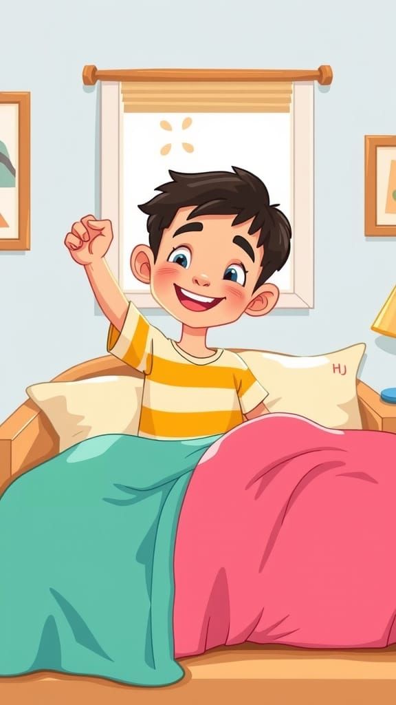 A delightful illustration shows Ali, a young boy, waking up in a bright bedroom. Sunlight streams through the window, creating a warm and joyful atmosphere in a classic children's book style.
