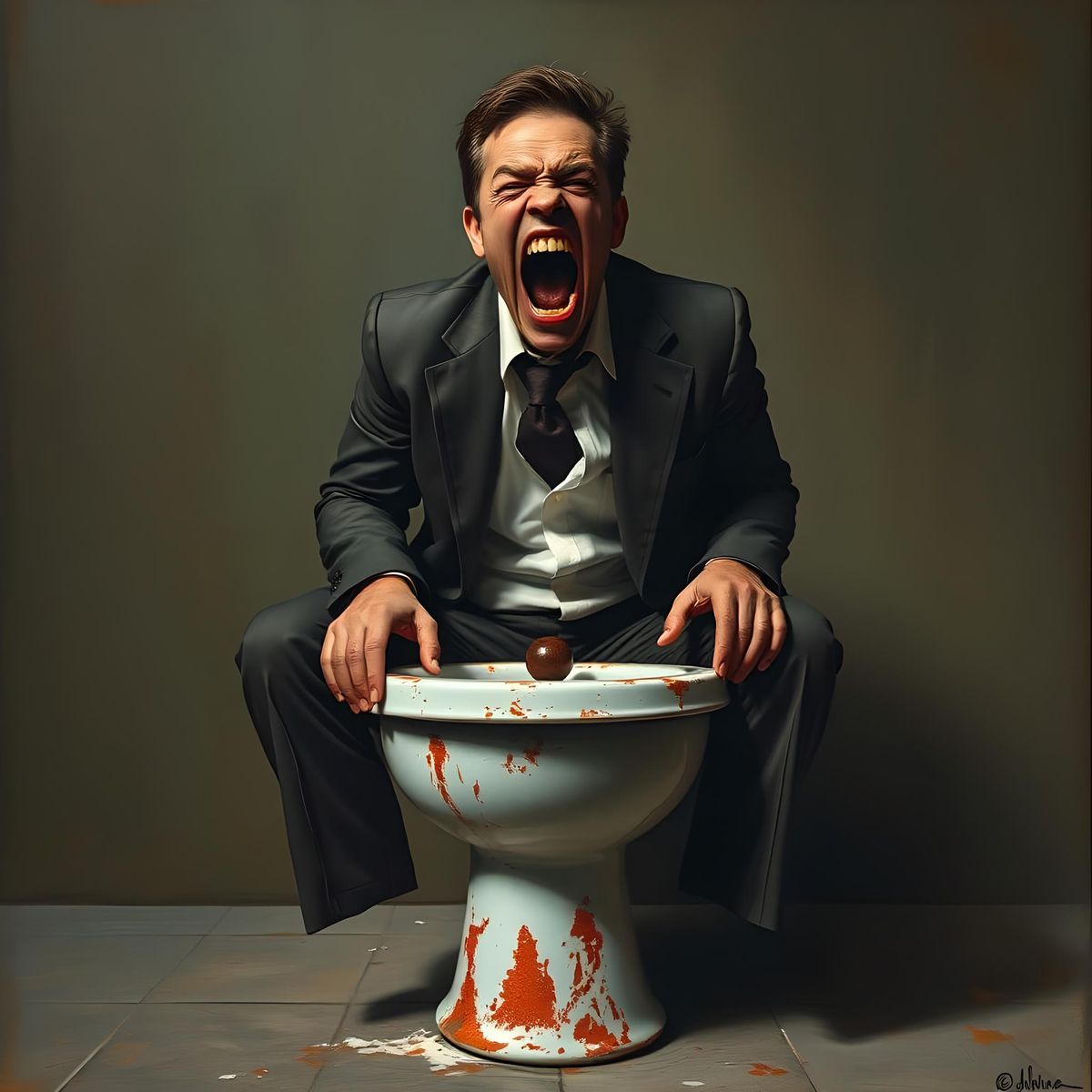 This image shows a man sitting on a toilet bowl, screaming. It is reminiscent of Edvard Munch's "The Scream", and uses a diagonal perspective.