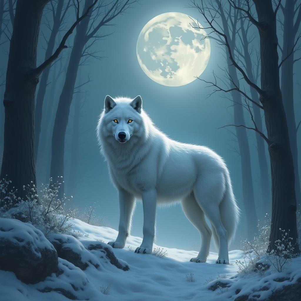 This image shows a majestic white wolf standing proudly in a serene, moonlit forest, surrounded by towering trees and a misty fog, with a dreamlike quality reminiscent of atmospheric fantasy art.
