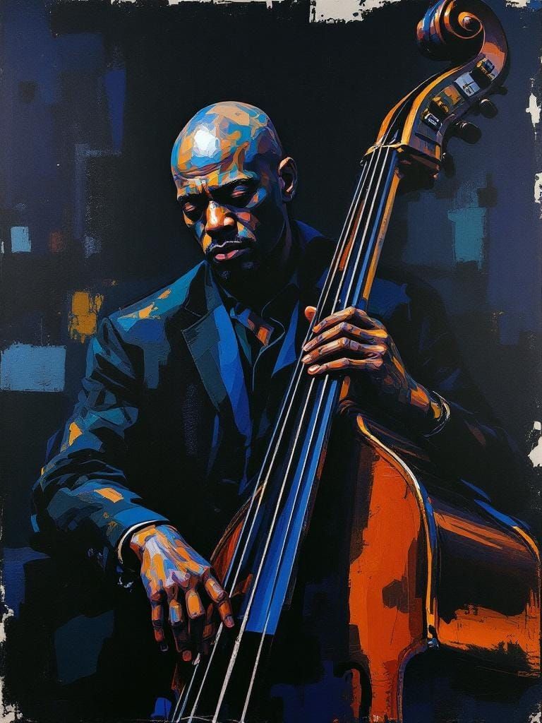This image shows an abstract man with a somber expression holding a double bass. Evoking gestural expressionism with collaged elements, it captures the improvisational flow of jazz in deep blue tones.