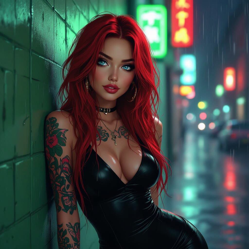 A digital oil painting of a sassy woman with bright red hair and shimmering skin, set against a rainy urban backdrop. The artwork features bold brushstrokes and vibrant colors.