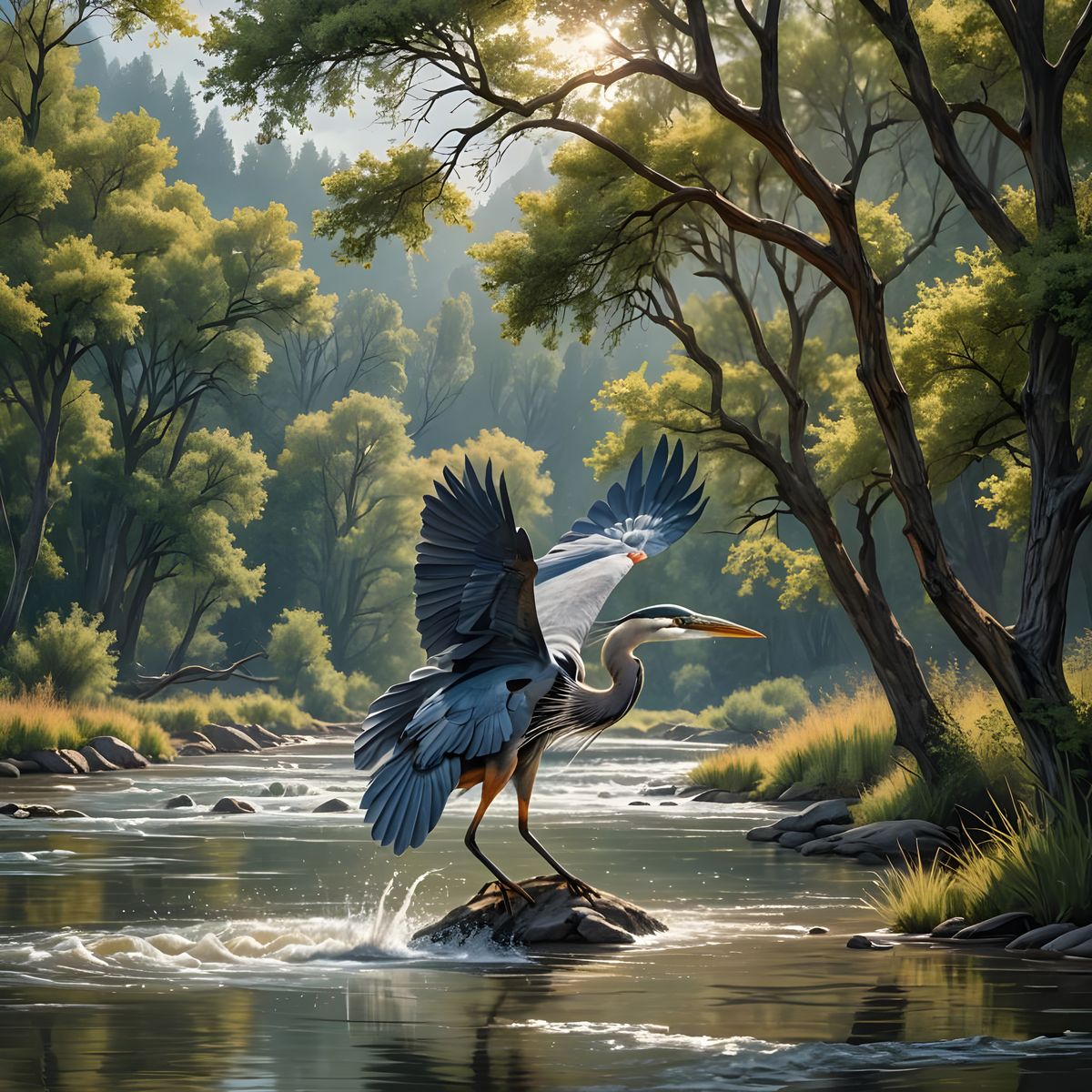 A detailed mixed media image of a heron diving to catch a large fish in a river. The artwork shows a wide sky and trees lining the riverbank, rendered in 8K resolution.