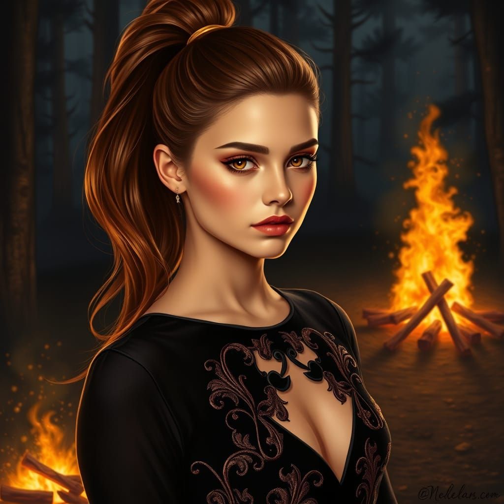 This digital painting showcases a woman with striking amber eyes and mahogany hair, adorned in a velvet gown with flame embroidery. A bonfire illuminates the scene, rendered with dramatic lighting and rich textures.