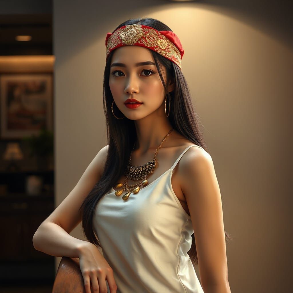 This image shows a confident young woman with long dark hair styled in an elegant headband. She wears a sleek tank top with layered gold jewelry, posing confidently with one arm resting on a surface.