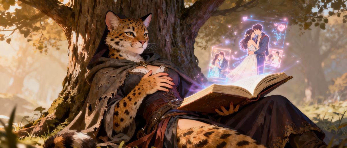 This image shows a beautiful anthropomorphic lynx in a fantasy setting, reading a book that projects holographic romantic scenes. The art style is soft and enchanting, reminiscent of high fantasy anime.