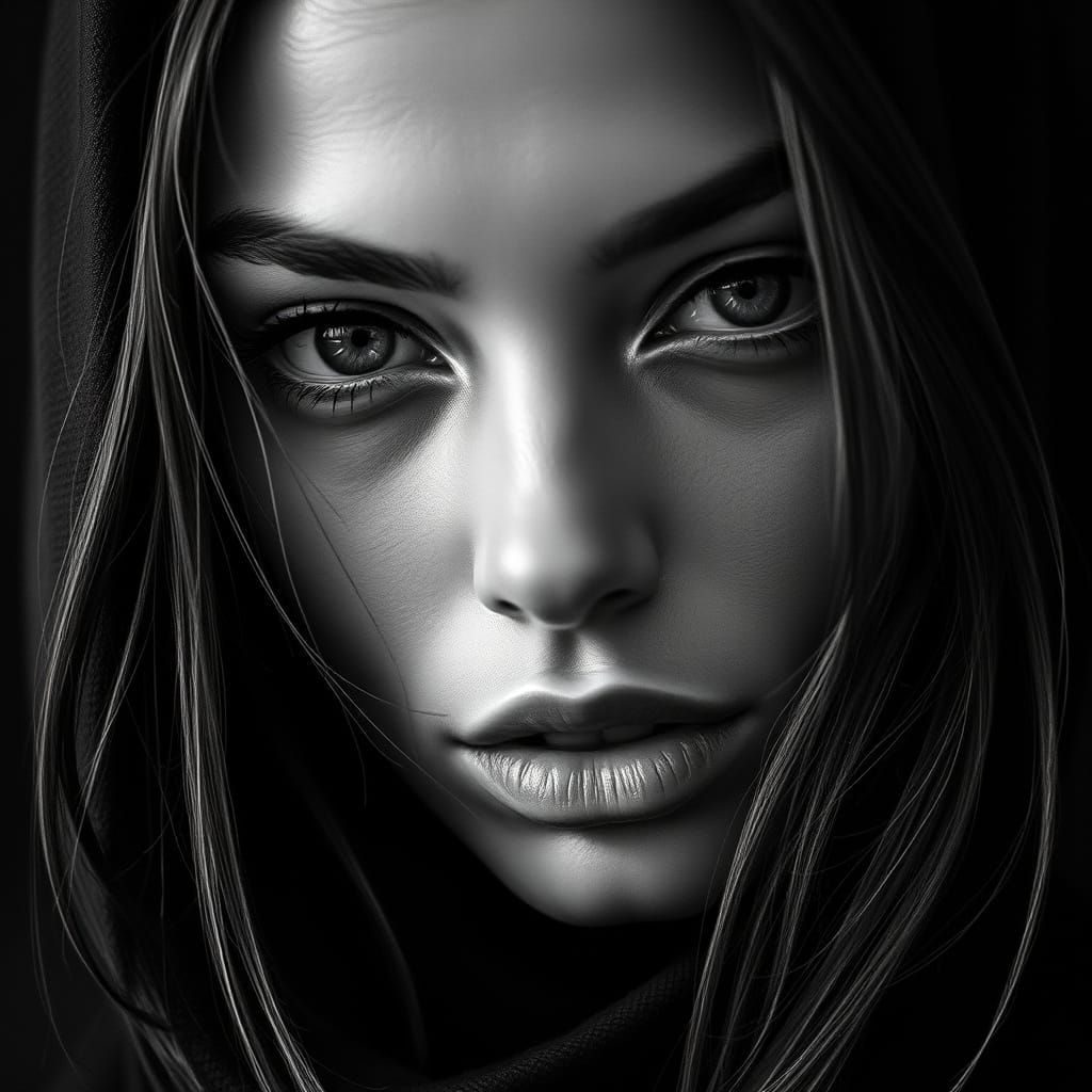 This striking black and white portrait showcases a stunning supermodel face in exquisite close-up, featuring cinematic lighting and atmospheric effects reminiscent of fine art photography, with a modern twist and digital finesse.