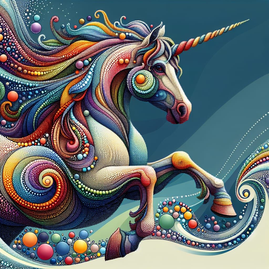A vibrant pointillist painting of a unicorn. The artwork employs distinct dots of complementary colors, reminiscent of 19th-century post-impressionism. Rendered in high definition, suitable for a splash screen.