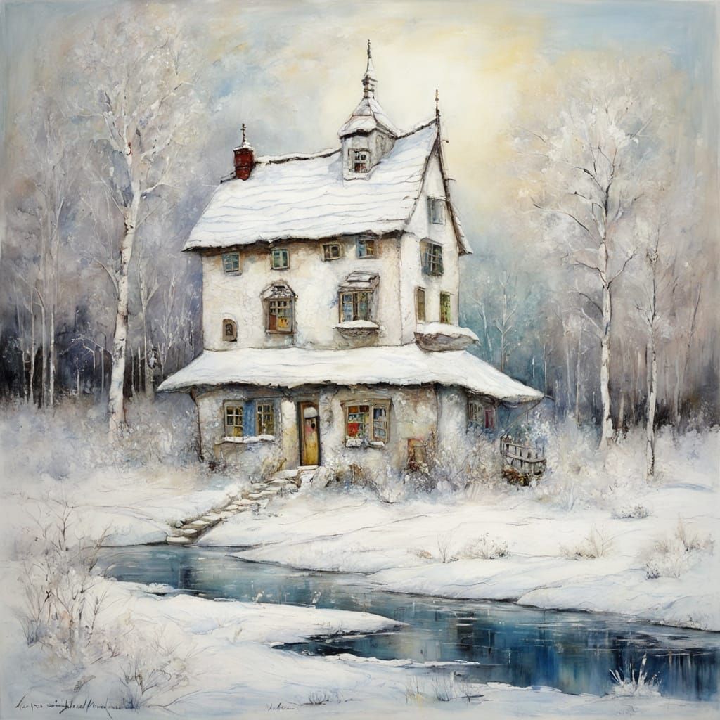 This image depicts a charming white cottage nestled beside a frozen lake, rendered in a textured, naive encaustic painting style with a minimalist color palette.
