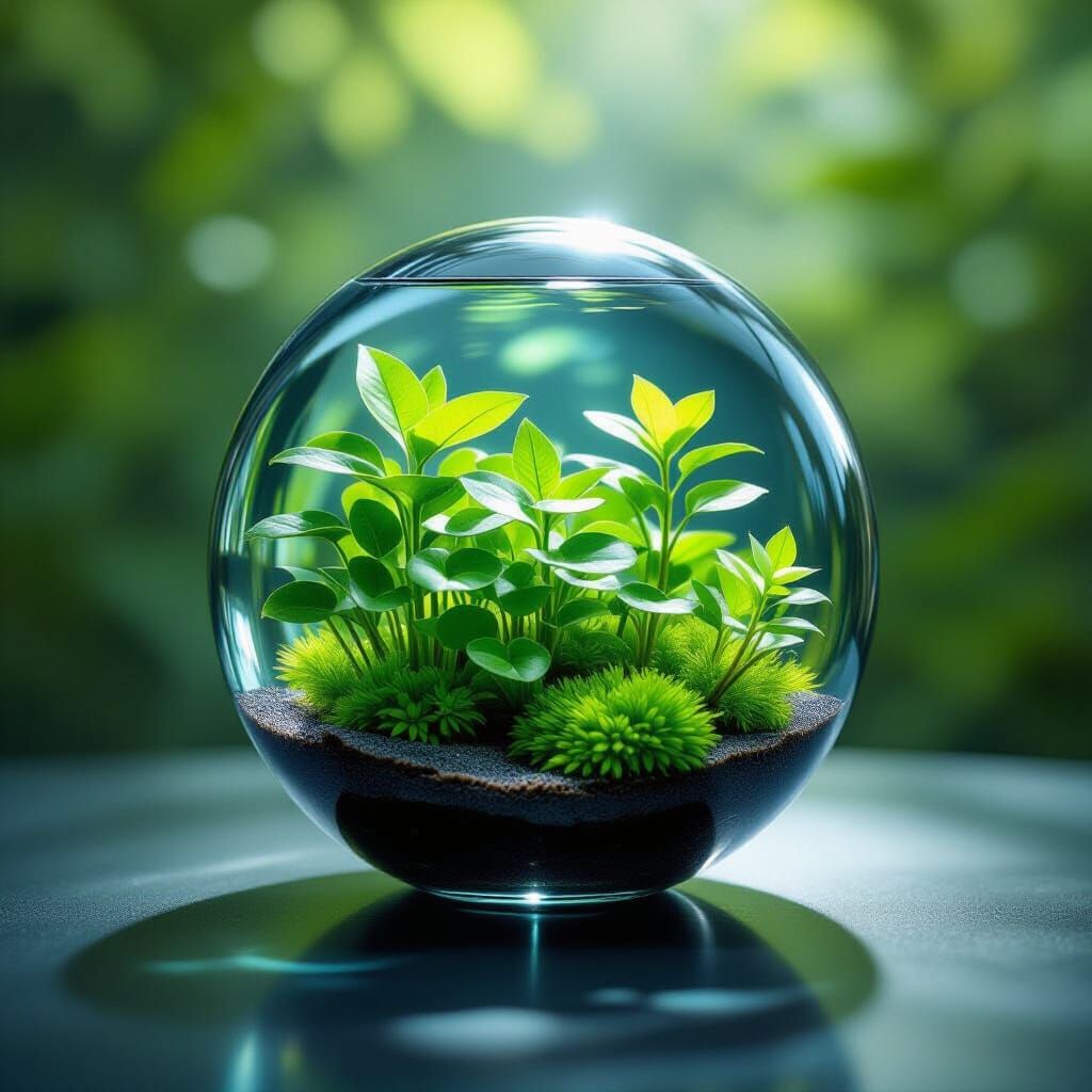 This image shows a glass sphere filled with vibrant aquatic plants, bathed in soft, diffused light. It evokes a serene, ethereal mood, reminiscent of macro photography and detailed scientific illustrations.