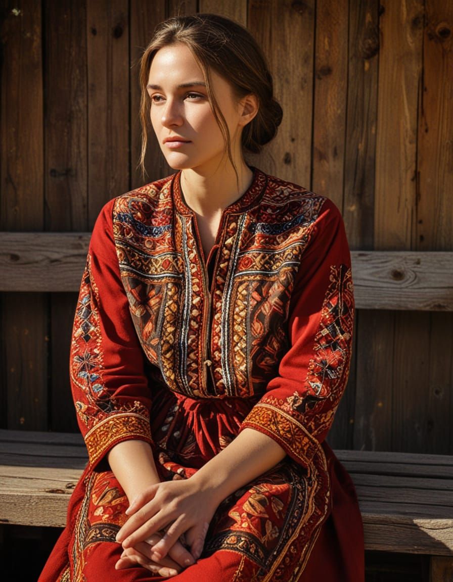 This image is a warm and inviting oil painting of a woman in traditional Romanian folk attire, surrounded by rich textures and earthy tones with bursts of red and gold.