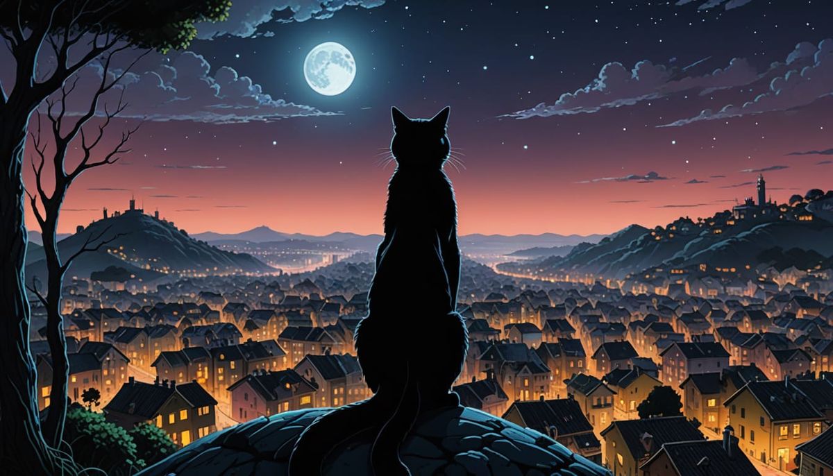 This image depicts a confident cat-woman in a sleek black suit, posed dynamically on a rooftop. A large moon casts an iridescent glow, set against a surreal, neon-lit cityscape in 3D.