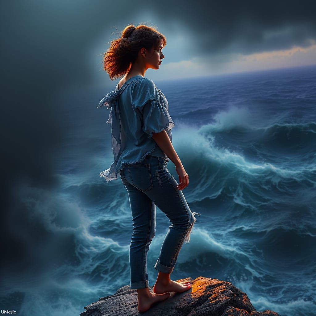 This dramatic, dark fantasy image captures a young woman's resolve as she stands at the edge of a rugged cliff, gazing out into a turbulent, dark grey sea. With intricate details and a deep, rich color palette, this artwork evokes a mystical, otherworldly realm.
