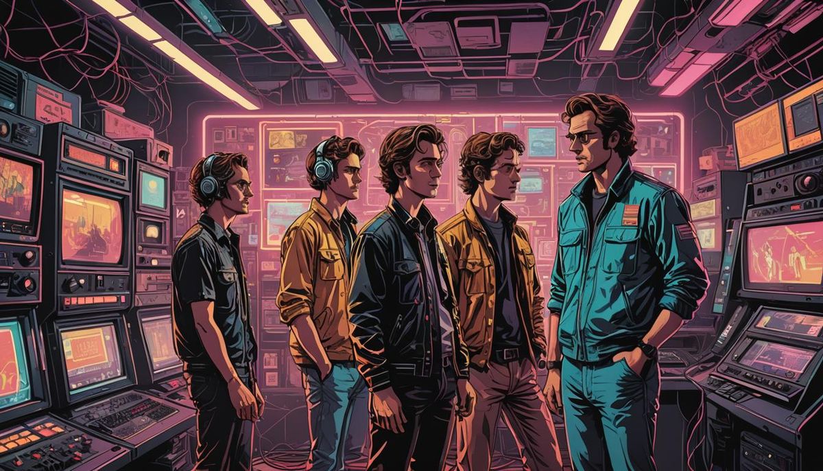This image shows Mark Brooks and Dan Mumford in a 1976 video studio, posing before their video recording installation. The scene is rendered with a comic book aesthetic and distressed synthwave textures, reminiscent of a cyberpunk dystopia.