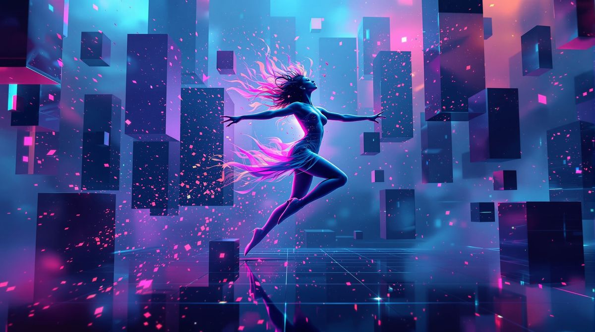 This image shows an abstract dancing girl with colorful ink spots. The artwork features intricate light reflections and a dynamic background with perfect cubes, rendered in a maximalist style.