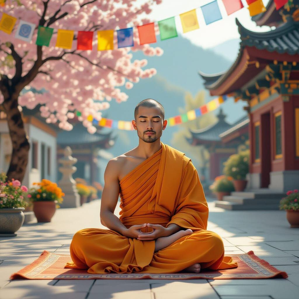 This image shows a monk in meditation surrounded by prayer flags and temple architecture. The scene is bathed in soft, warm light, with textures reminiscent of impressionist paintings.