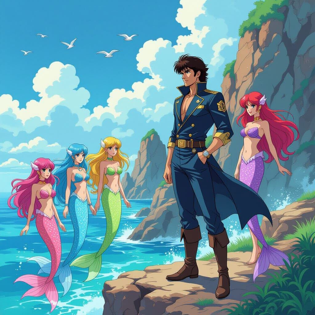 This image depicts Ryo Saeba from City Hunter encountering mermaids on a cliffside. The scene blends dynamic action, vibrant colors, and unique character designs, reminiscent of anime and futuristic art styles.