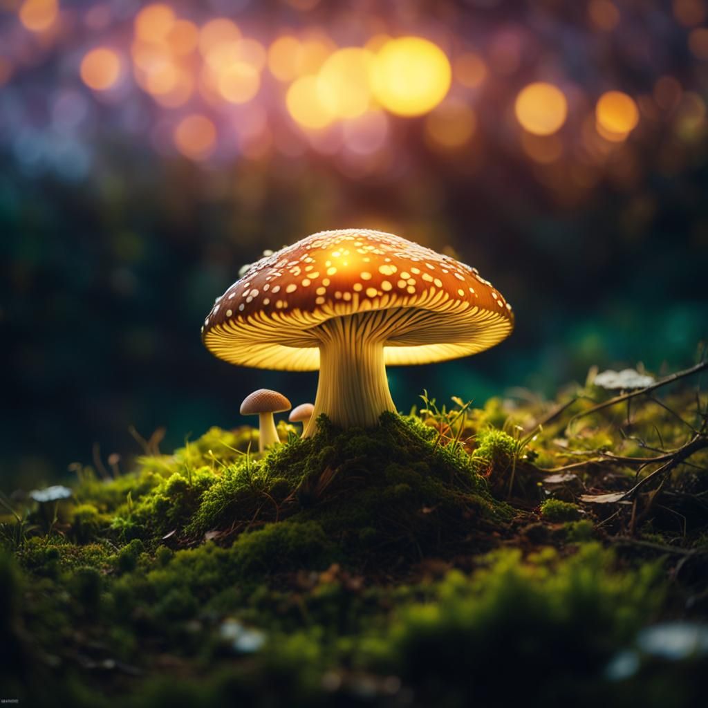 This image shows a close-up of a mushroom with a luminous double exposure landscape inside. The fantasy illustration features a dark sunset, cool lighting, and intricate details in a cinematic, photorealistic style.