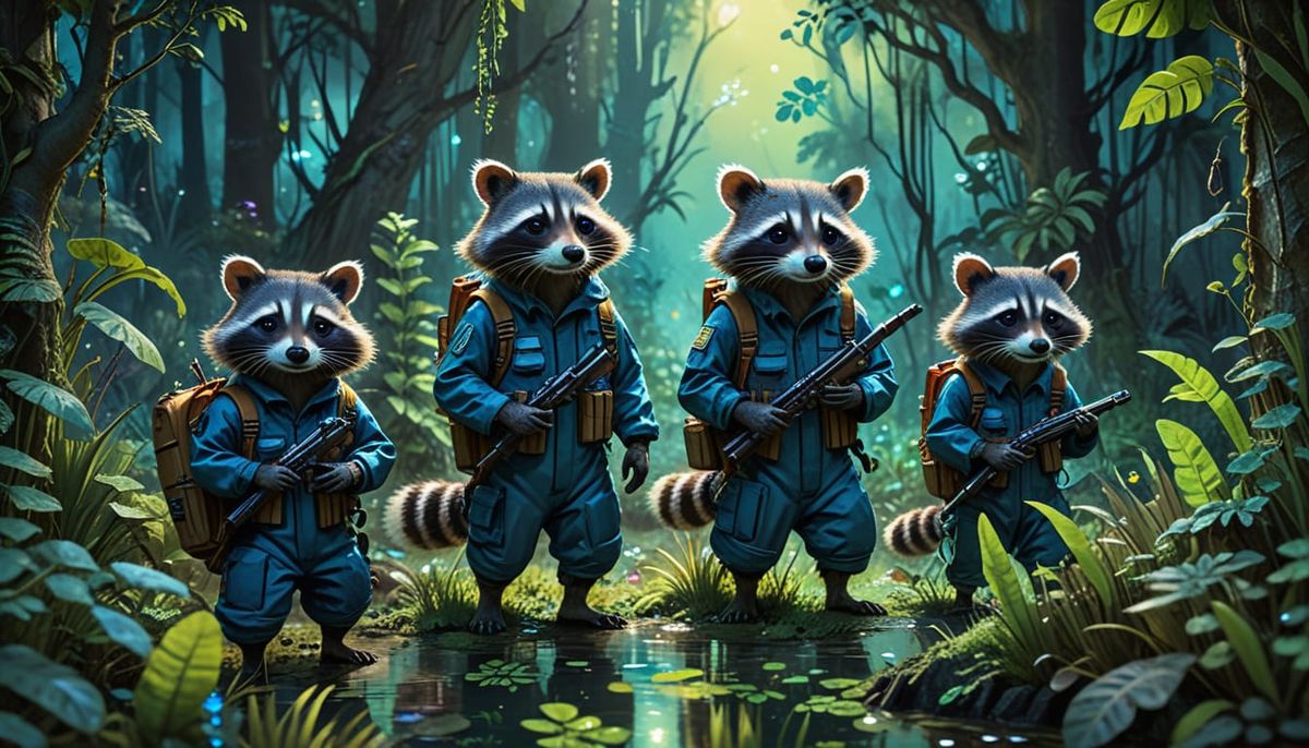 This image shows a raccoon family in environmental suits exploring a bright, bioluminescent jungle. The whimsical watercolor painting features soft lighting and intricate details, reminiscent of classic animated styles.