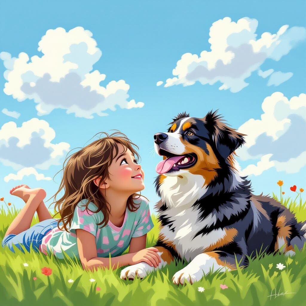 This image shows a girl and her dog gazing at heart-shaped clouds. The pastel-toned digital painting captures a peaceful moment of companionship in a whimsical style.
