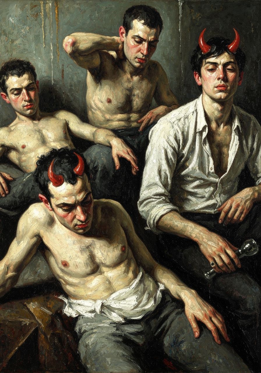 This image is a gritty neo-expressionist oil painting showing lazy, reckless individuals with dramatic chiaroscuro lighting. Textured brushstrokes and clashing accents convey chaos and decadence.